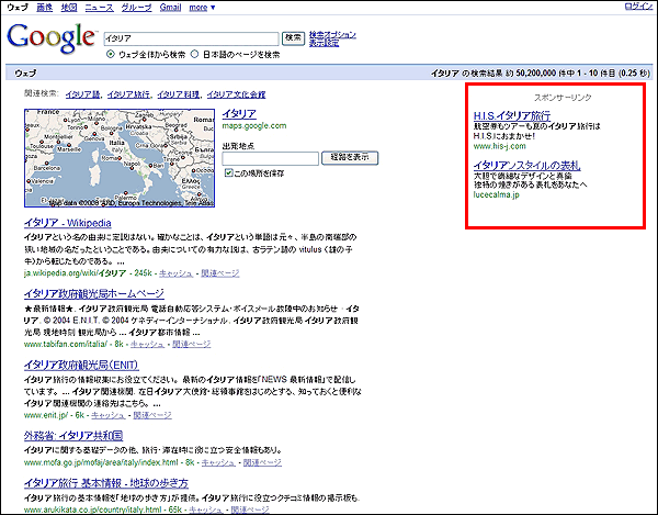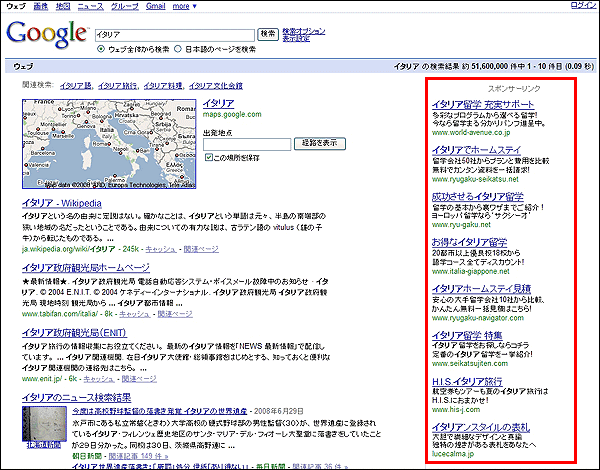 具体的に説明すると、例えば、グーグルで「イタリア」と検索すると、下図のような結果が表示されます。(2008年7月3日現在、赤枠が、アドワーズ広告)