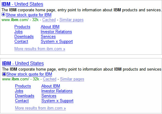 この場合では、ユーザーの反応の違いがはっきりしたので、どちらがより良いか非常に迅速に判断ができました。表示の違いはShow stock quote for IBMの隣のプラスボックスの太さです。さて、どちらの方が"本当により良いか"という結論を出すのは実は難しく、かなりの時間をかける必要があると思います。プラスボックスが目立つ方が良いのでしょうか?もしプラスボックスがより目立つことで、ユーザーが良い結果を見逃すことになるとどうでしょう?どちらのバージョンが採用されるかGoogleを見続けて下さい!もし我々が正解を選んだ場合、気付かれないうちにユーザーにとって少しは良い方向に進むはずです。地球がバラ色になり、鳥がさえずり…とまではいかないでしょうが、少なくとも我々が作成したより良いデザインのプラスボックスを使う日が来るでしょう?