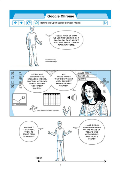実際にこのニュースが流れたのが9月1日で、グーグルの公式ブログでもGoogle Chromeのことは伝えられており、漫画家のScott McCloud氏によるイラストでGoogle Chromeを紹介するコミック冊子のスキャン画像が公開されています。