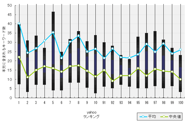 この結果から若干ではありますが、本文中のキーワードの数が減るにつれて、順位も下降することが分かります。ただし、キーワードの数は多ければいいというわけではなく、全体的に10個から20個くらいが丁度いいということが見て取れます。