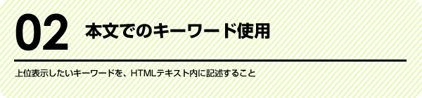 「本文、つまり対象となるウェブページ内にキーワードをバランスよく配置することで、SEOに効果的である。」というようなことが巷でよく聞かれます。