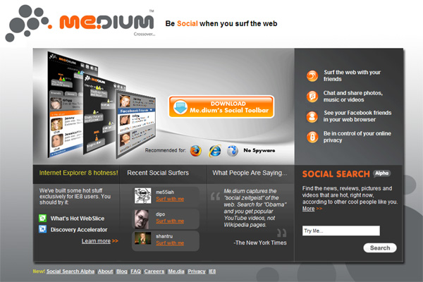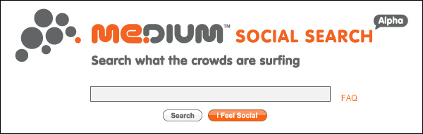 Me.dium(ミ・ディアム)という検索エンジンは、Social Search(ソーシャルサーチ)として、この検索エンジンを使用する仲間(ソーシャル)が頻繁に検索するキーワードや、注目されているニュースやウェブサイトをリアルタイムに検索結果に反映する検索エンジンです。
