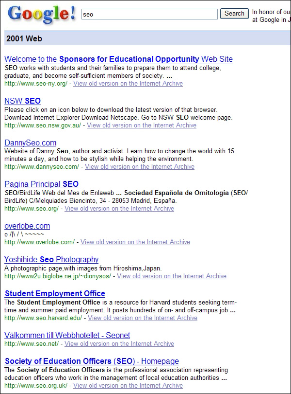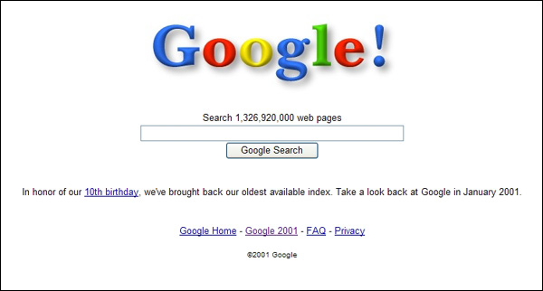 Googleが10年を記念して2001年当時の検索結果をタイムマシンのように見れるサービスを一時的に公開しています。
