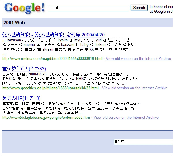 2001年の検索結果を今見ることができるということは、Googleのサーバーは、常に、世界中のユーザーが検索したキーワードの検索ログと表示ページのタイトルとスニペット(紹介文)を保存していることが推測されます。(あくまでも推測です。ひょっとしたら、たまたま2001年だけログを取っていただけかもしれません。)