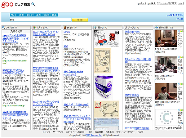 NTTレゾナント株式会社が運営する、検索エンジン goo で、2008年11月4日から「goo複合検索」サービスを開始しました。