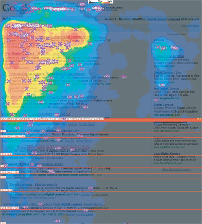 また、Enquiro社 の Gord Hotchkissは次のように追加しています。「過去の研究では、検索者がリンクをクリックするまでにもっと時間をかけると考えられていましたが、今回の研究を含め、眼球がどこで止まるかということが非常に重要であり、またクリックは以前考えられていたよりもずっと早く行われるという研究結果が導き出されました。この結果から検索マーケティングは不動産ゲームであるといえます。つまりは場所が全てである、ということです。」